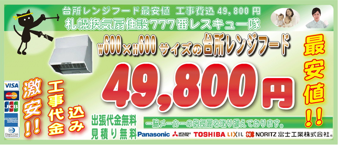 札幌エリア換気扇(レンジフード)工事代金・最安値挑戦!台所のレンジフード・工事代金無料
