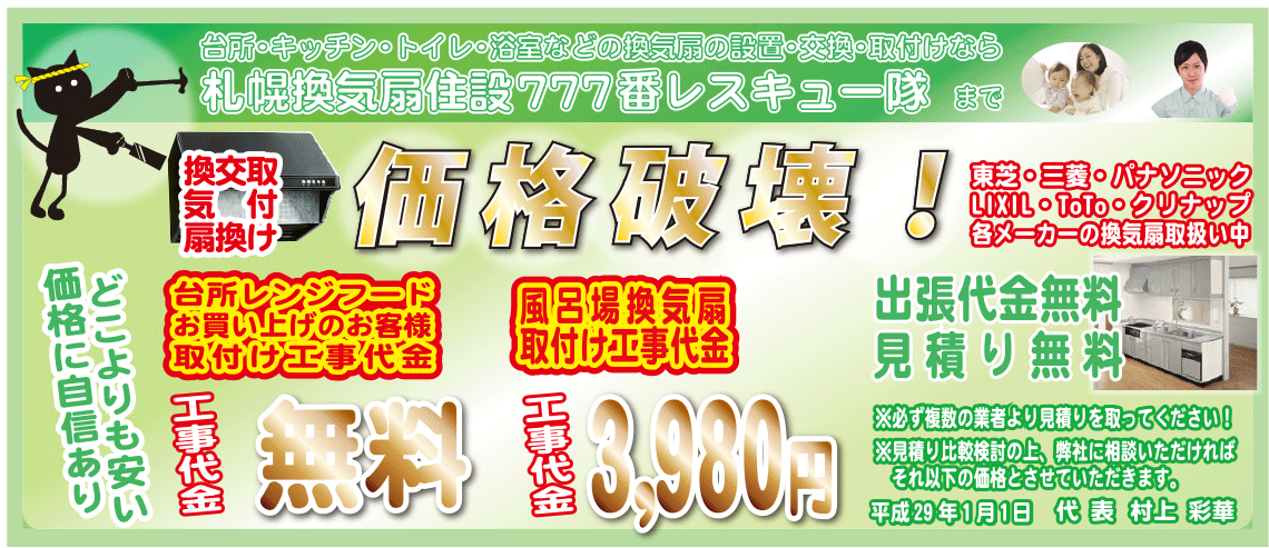 換気扇の取付け工事代金 価格破壊!・業界最安値!に挑戦中!|札幌換気扇住設777番